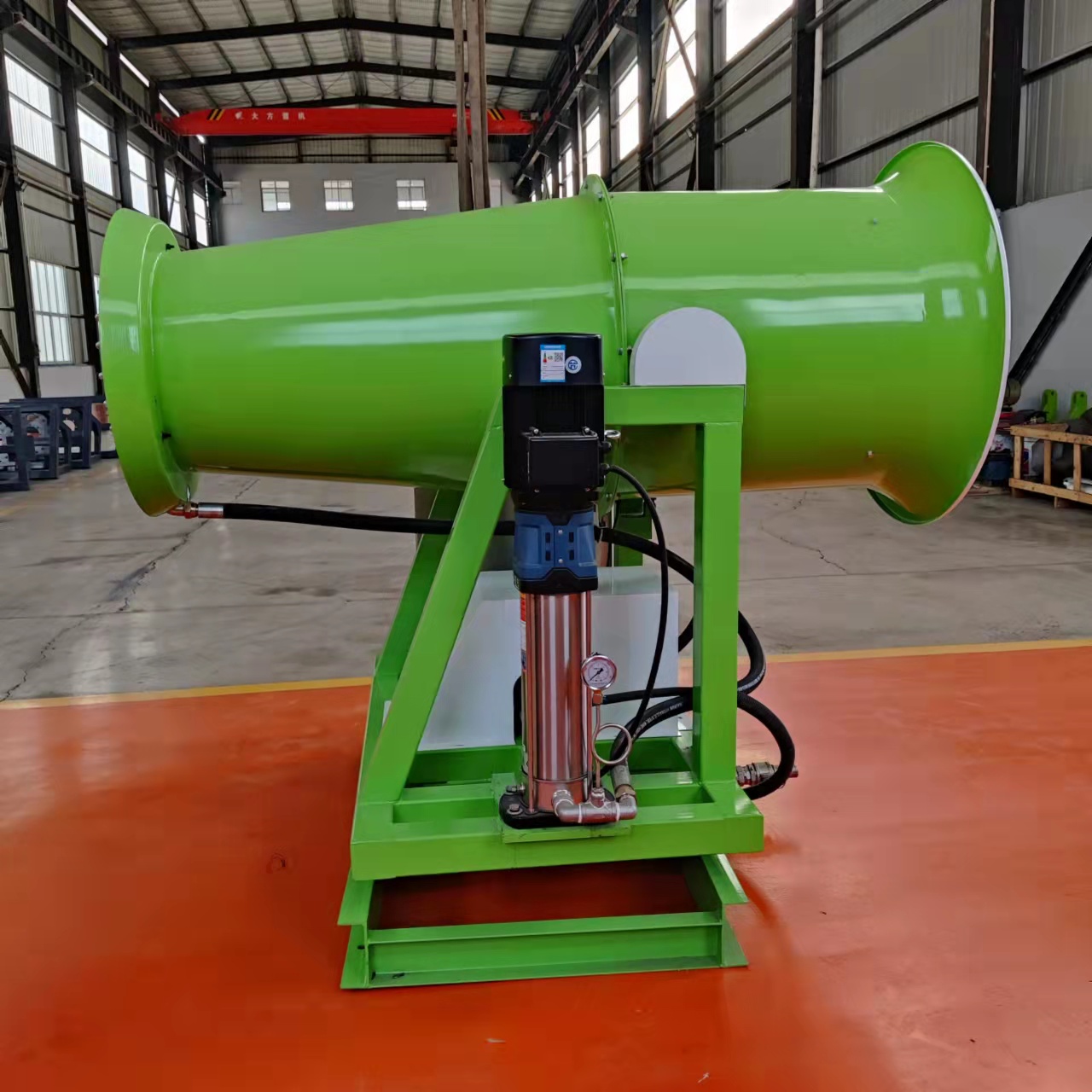 噴霧除塵設備主要采用高壓原理。首先通過(guò)高壓泵將水通過(guò)高壓管道輸送到霧化噴嘴,然后利用霧化噴嘴內置的小撞針將高速流動(dòng)的高壓水切割成細小的微米級水霧顆粒。這些水霧顆粒在壓力的驅動(dòng)下被噴射到空氣中。由于它們的粒徑與塵粒相近,可以相互吸引,結合沉降,降低了空氣中的粉塵濃度和污染程度。
