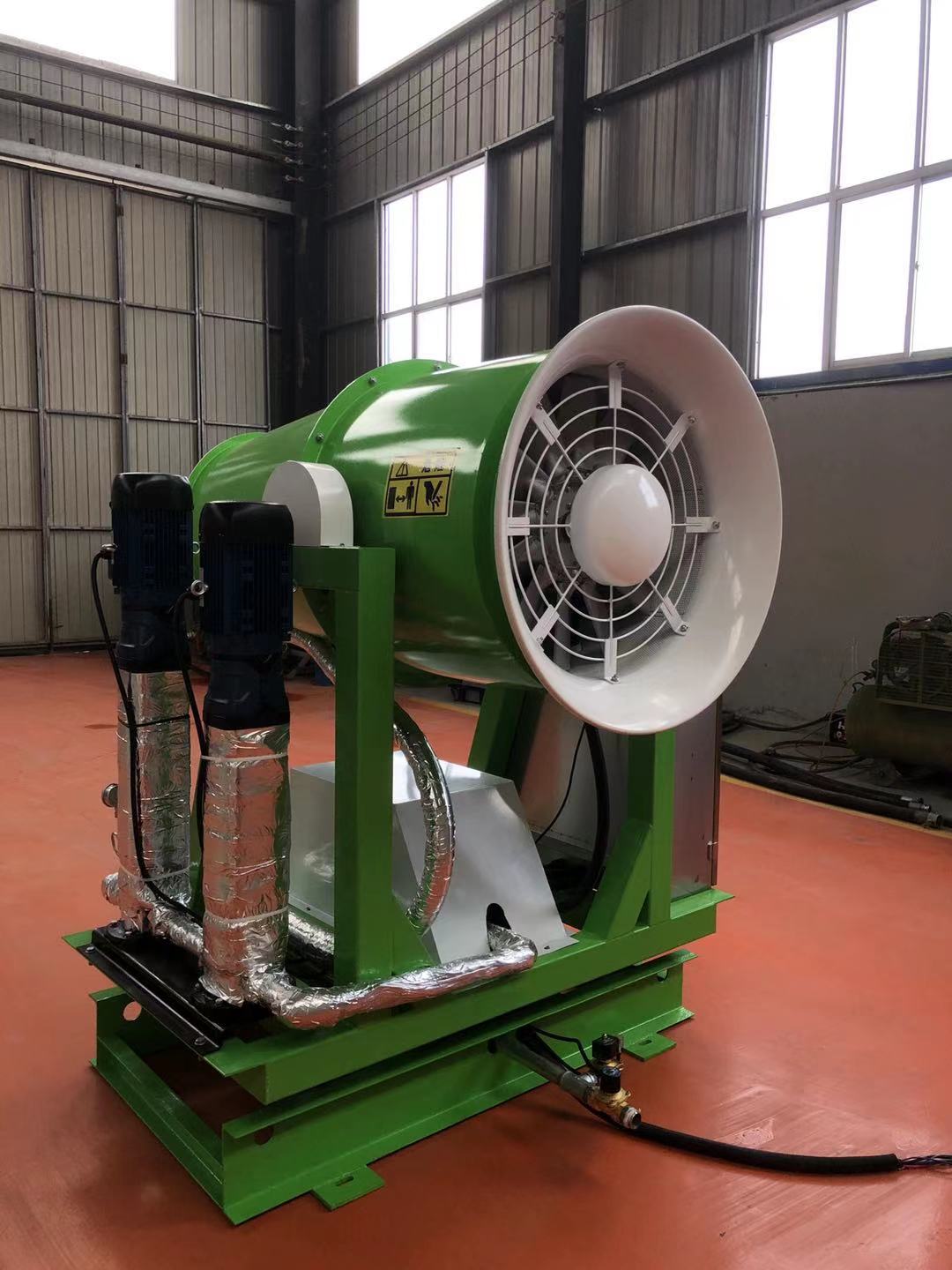 霧炮機通過(guò)高壓將水霧化成微米級的水霧顆粒,與粉塵顆粒物大小相當,與城市中的霧霾碰撞、吸附,凝結成粉塵團并沉降。