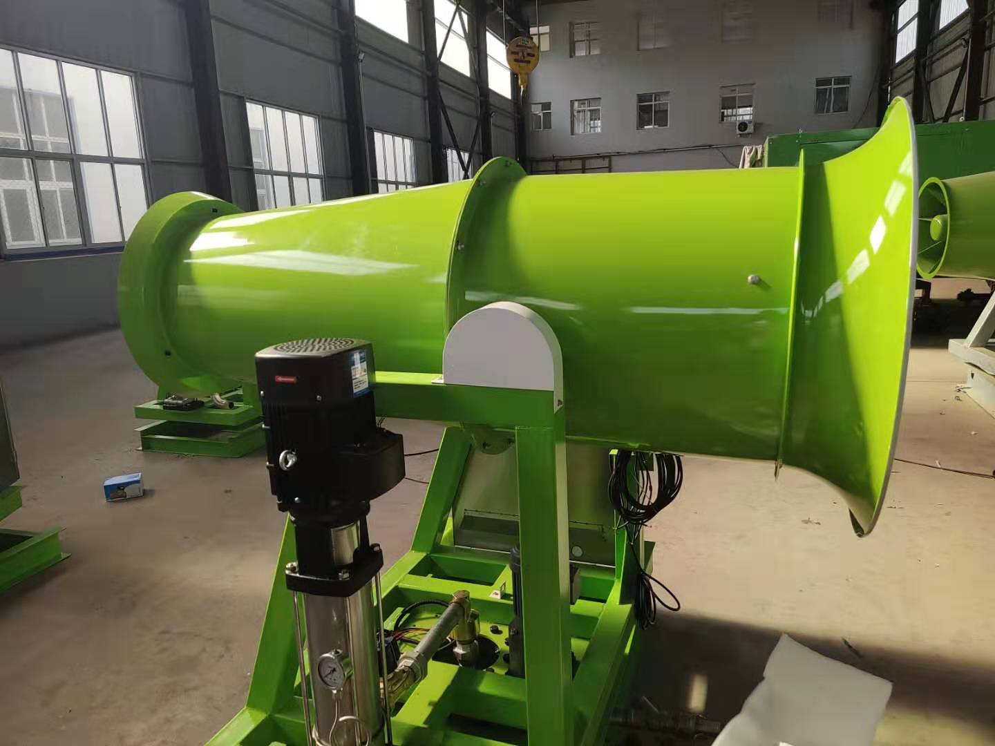 霧炮機接電源和水源時(shí)注意要點(diǎn): 1)霧炮機使用的是由發(fā)電機組提供的工頻電源(也可外接市電電源),電動(dòng)機額定工作電壓AC380V,發(fā)電機組輸出交流電壓400V,50Hz。 2)當使用三相380V市電時(shí),在接入霧炮機電控箱前必須要有電源開(kāi)關(guān),在電源開(kāi)關(guān)上應有良好的接地;電源線(xiàn)接至設備電控箱內。 3)在接電源線(xiàn)時(shí),應先將電控箱前的電源開(kāi)關(guān)斷開(kāi)、處于OFF位置,經(jīng)檢測確認無(wú)電后方可進(jìn)行接線(xiàn)作業(yè)。 4)采用三相五線(xiàn)制,選擇電源線(xiàn)時(shí),應根據產(chǎn)品技術(shù)參數上所載明的總功率而確定使用線(xiàn)徑,以確保電源線(xiàn)有足夠的載荷能力。 5)水源裝接時(shí),設置噴霧專(zhuān)用閥門(mén),經(jīng)半工閥門(mén)后直接將采用管路連接霧炮機進(jìn)水口和水箱出水口即可。